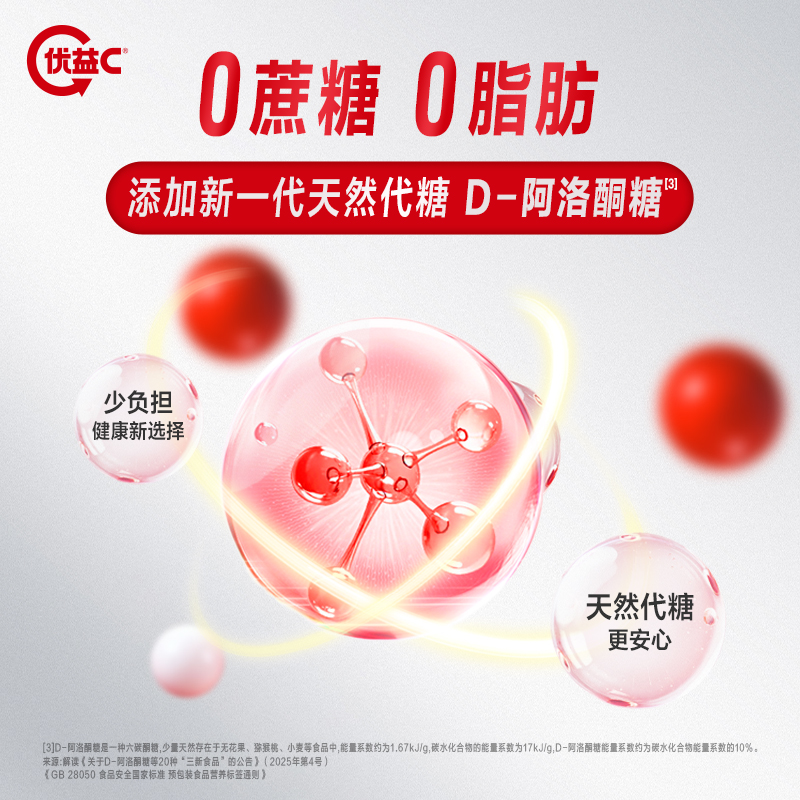 ?發酵生態的革新: 益生菌發酵體系的穩定離不開碳源與基質環境的調控。優益 C 通過科學配比,創新性引入D - 阿洛酮糖作為非發酵性碳源。由于其獨特的代謝特性,D -阿洛酮糖幾乎不參與益生菌的發酵過程,從而有效維持體系滲透壓的穩定,并顯著減少因糖分轉化帶來的酸度波動。這一技術應用確保了每一瓶優益 C 在貨架期內的口感酸甜平衡與功效活性的高度一致性。